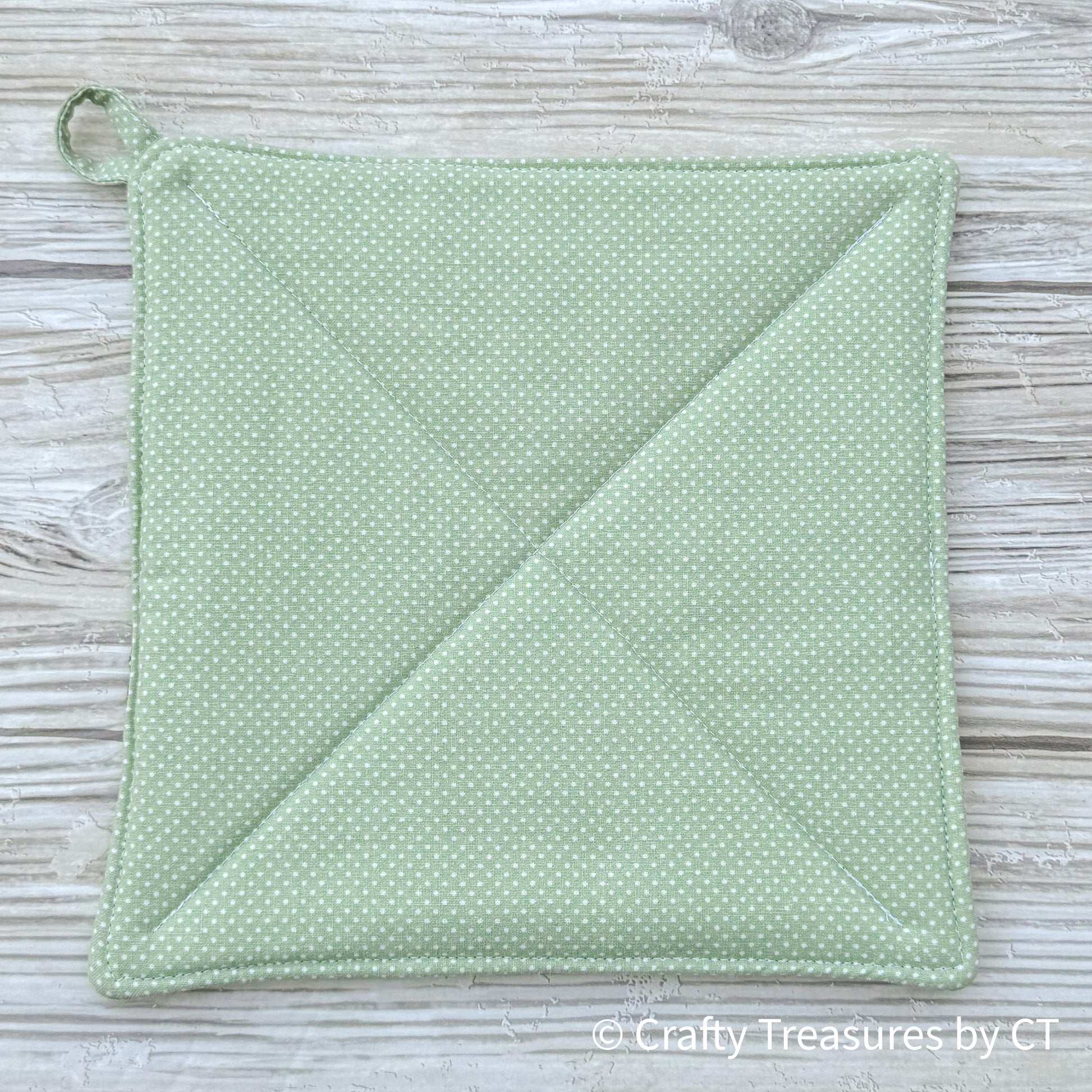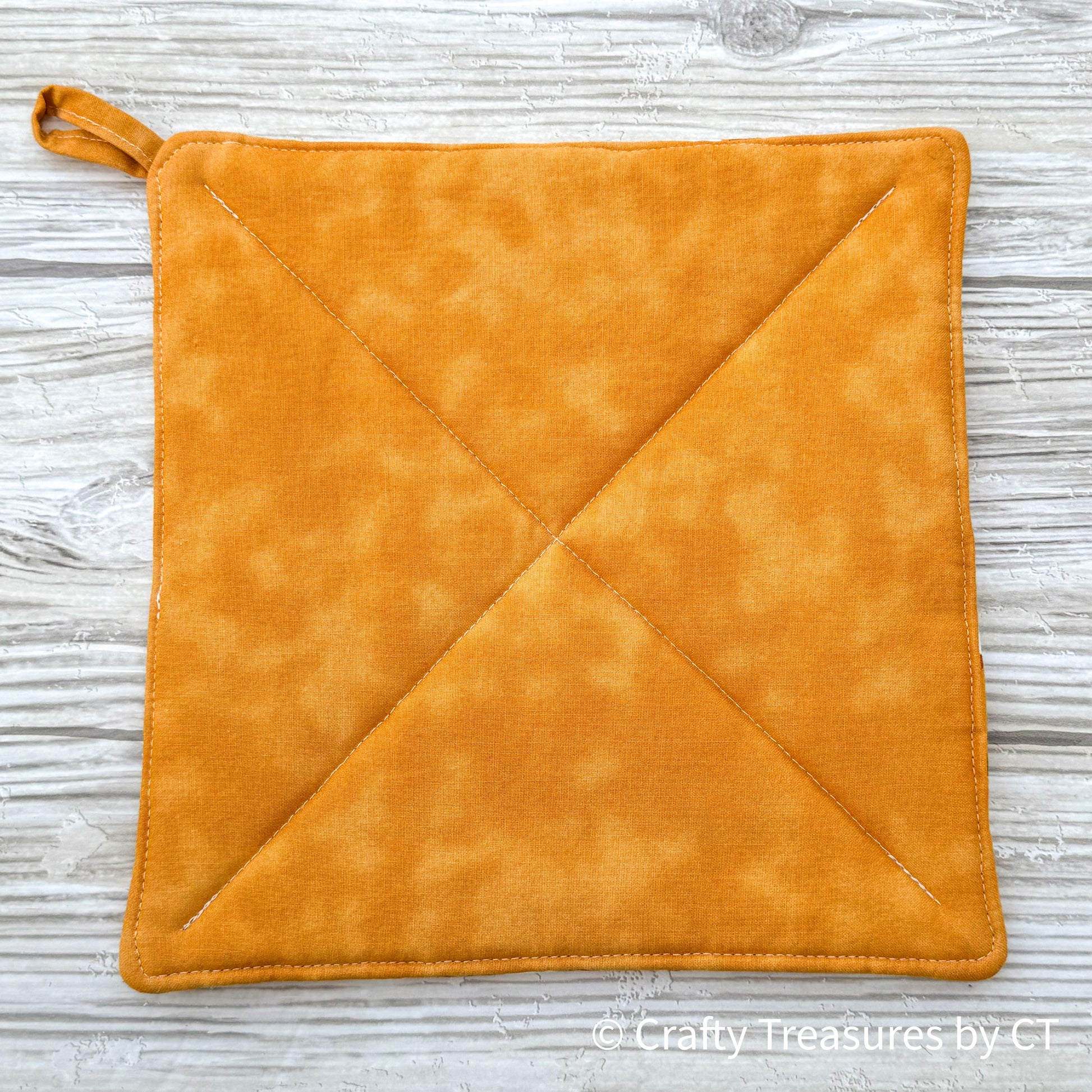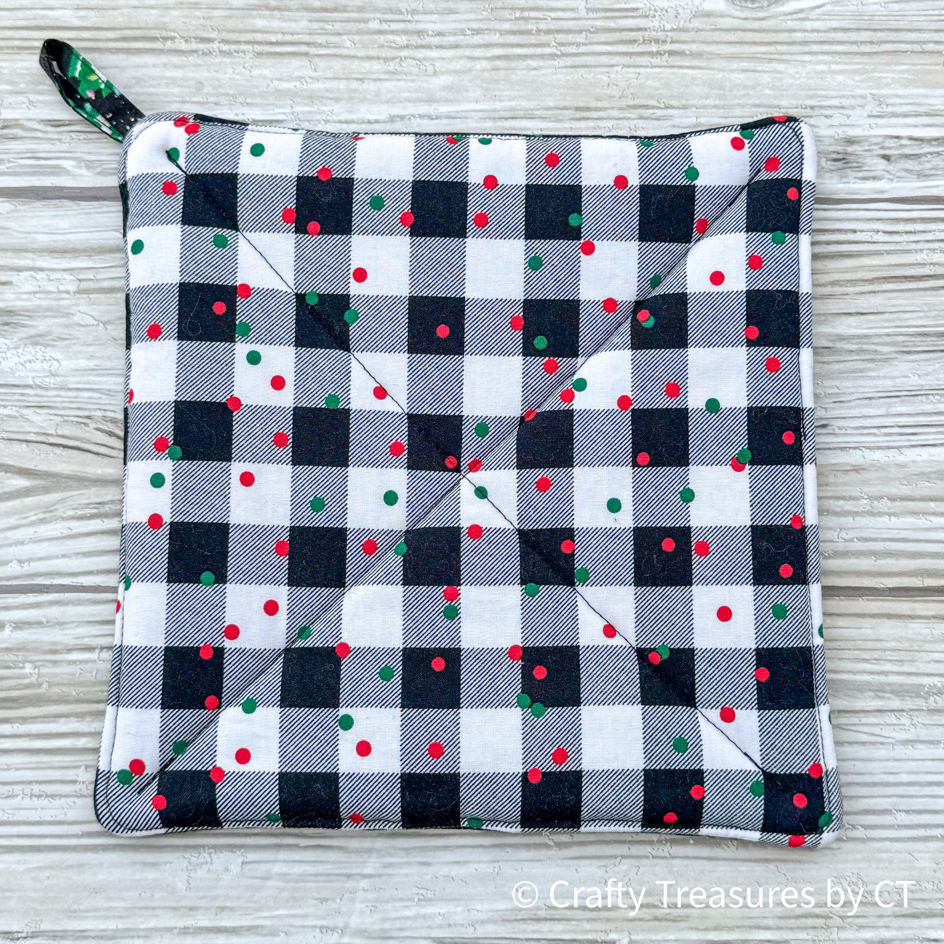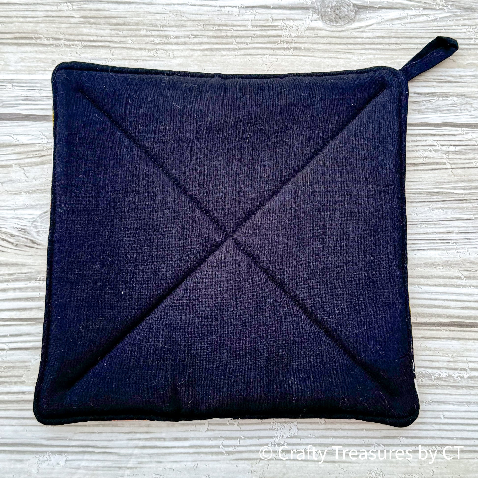 Each pot holder is made extra thick with a layer of insul-bright between two layers of cotton batting for extra heat protection. They are machine quilted and include a loop for hanging. The front and back fabric coordinate.