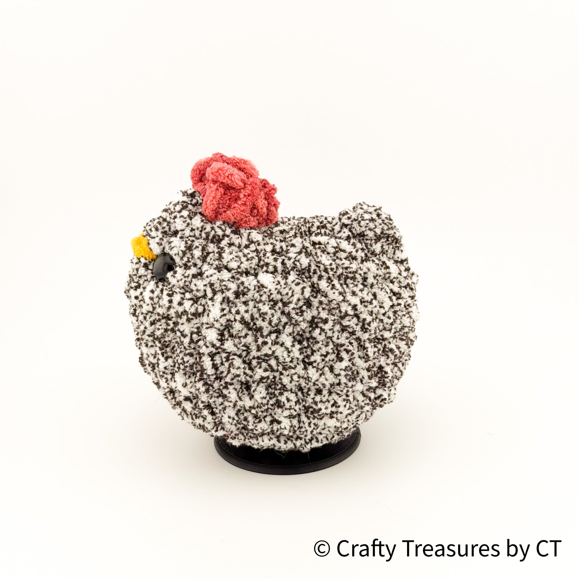 Due to the variety of yarns, each chicken is a little different. Mabel Chickens are approximately 5-5.5 inches tall, including the comb and approximately 4-5 inches in width.
