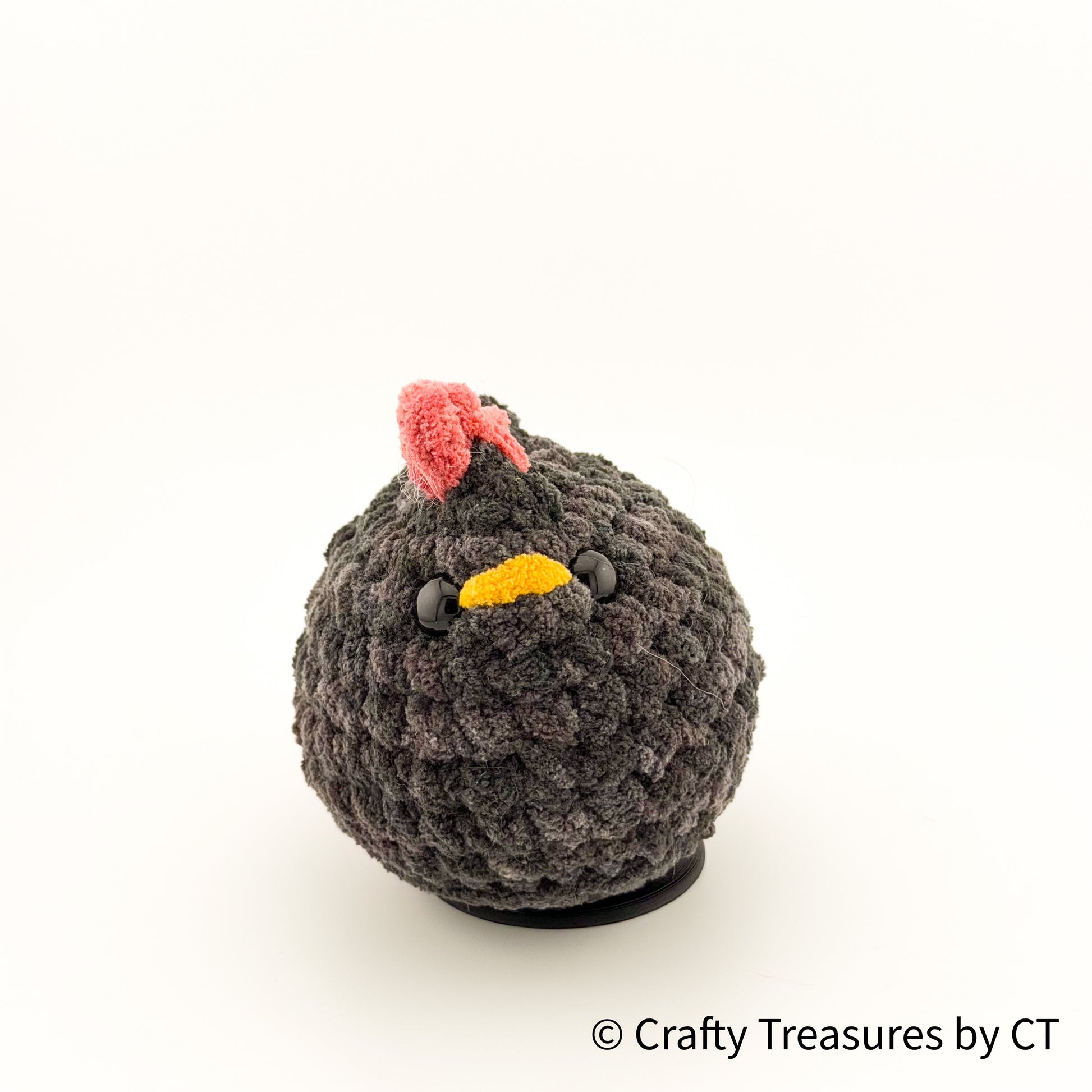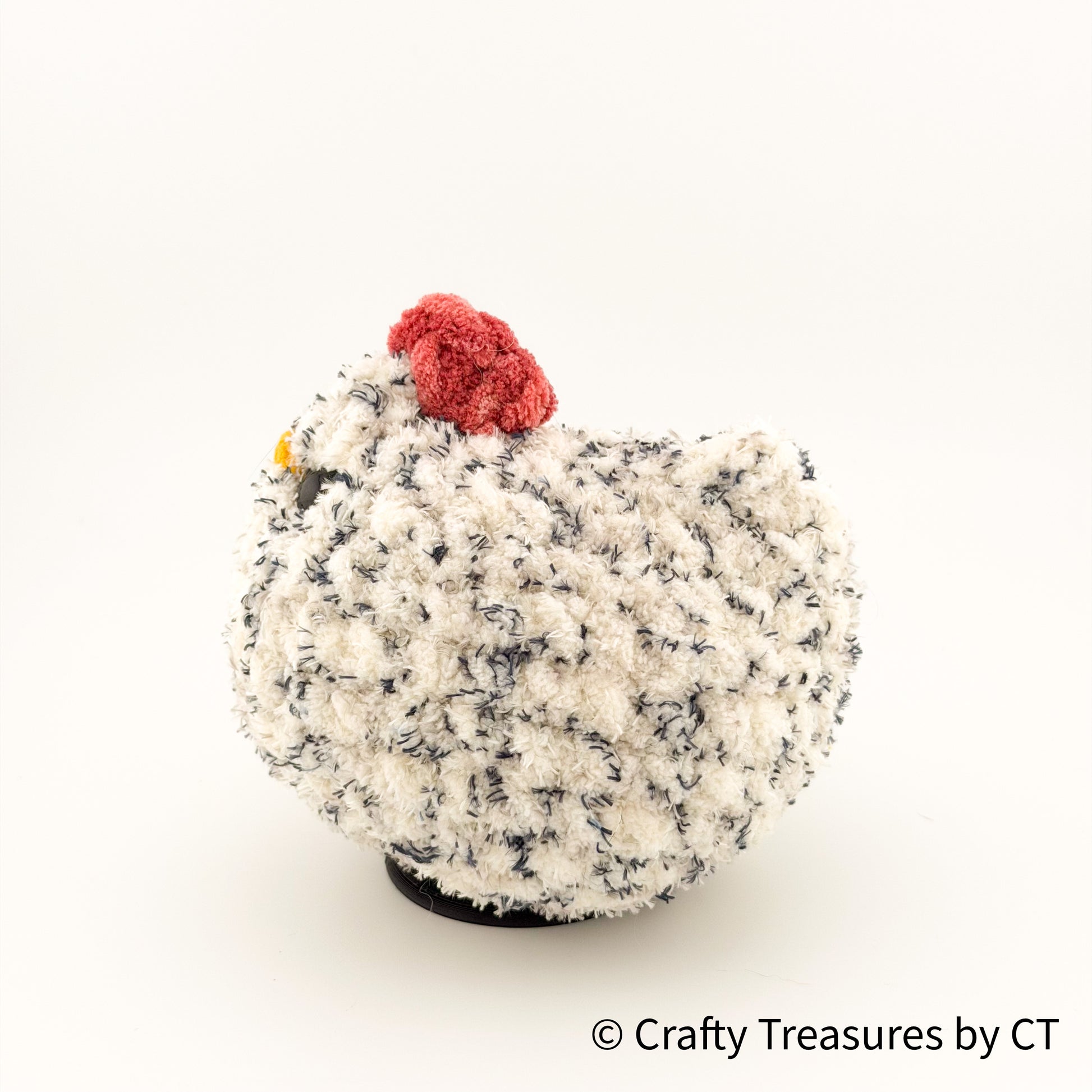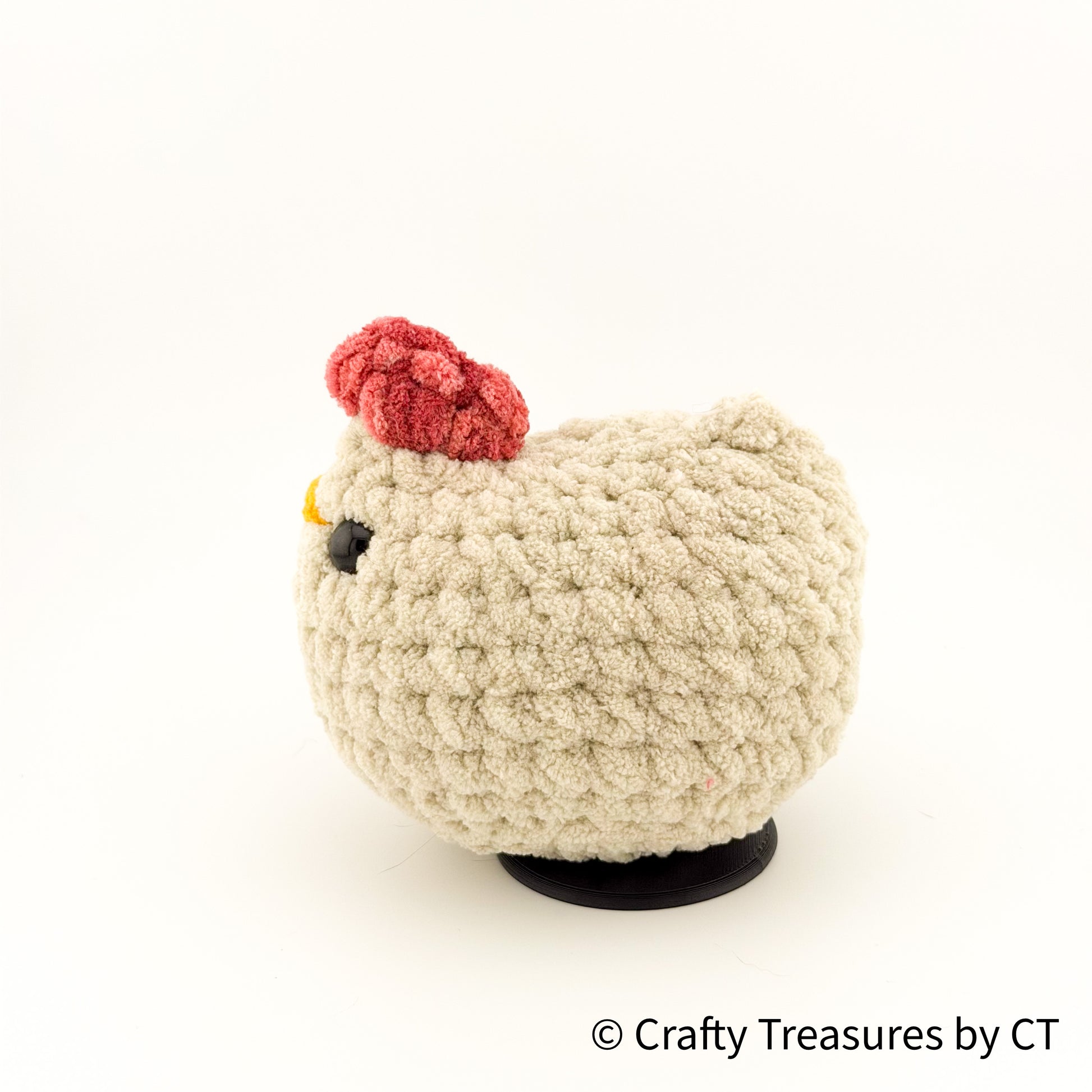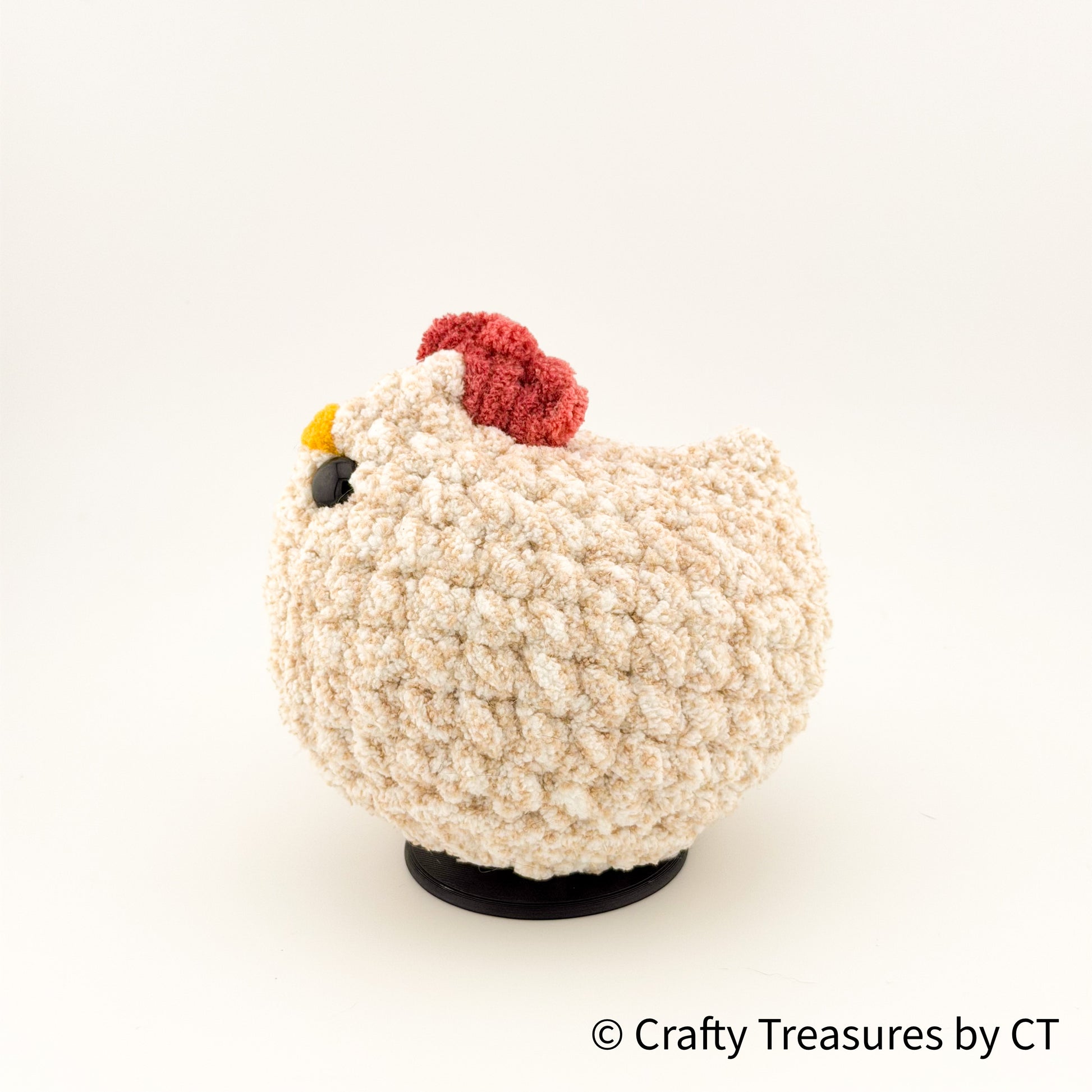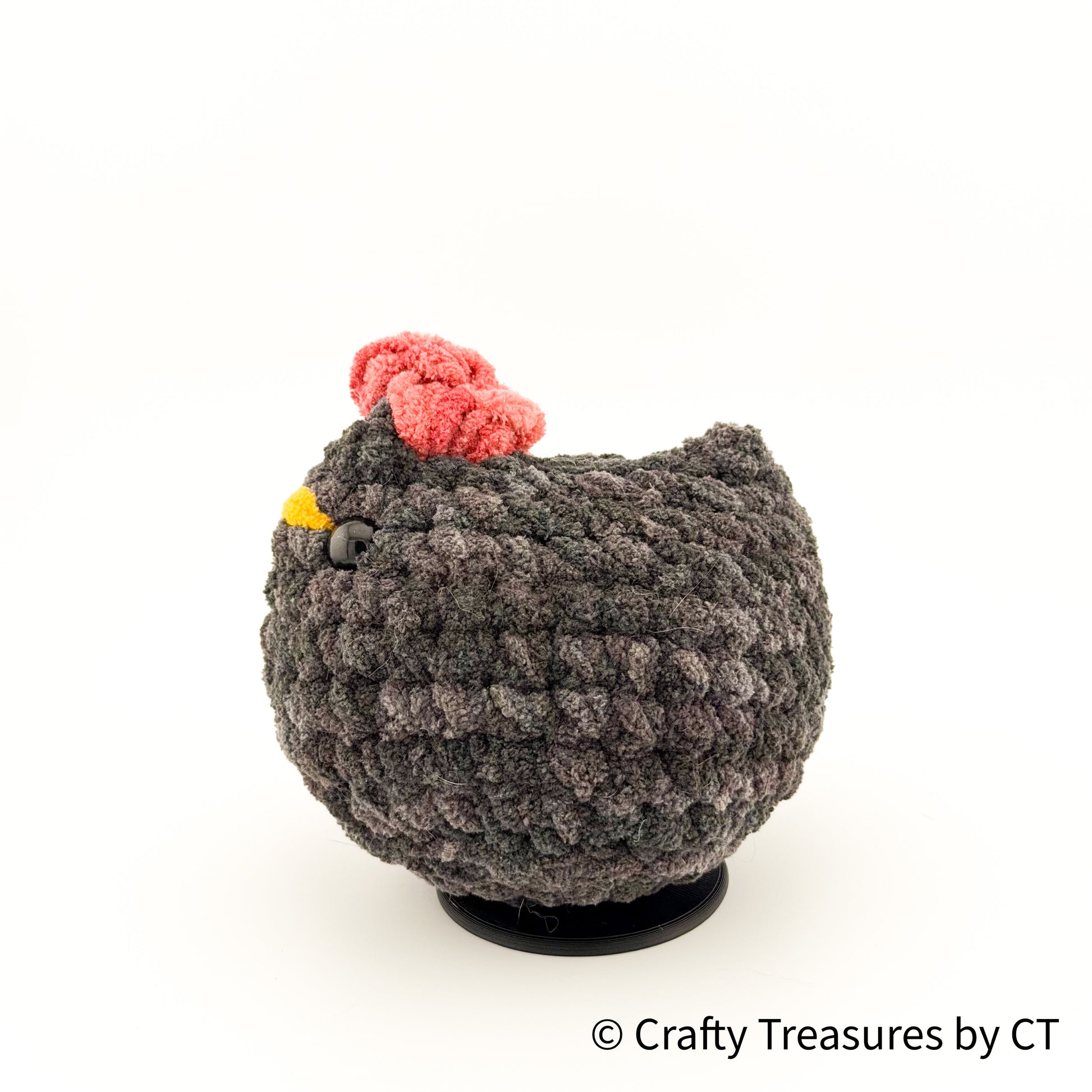 Each chicken is made with soft chenille yarn or soft blanket yarn, an embroidered mouth, and plastic safety eyes.