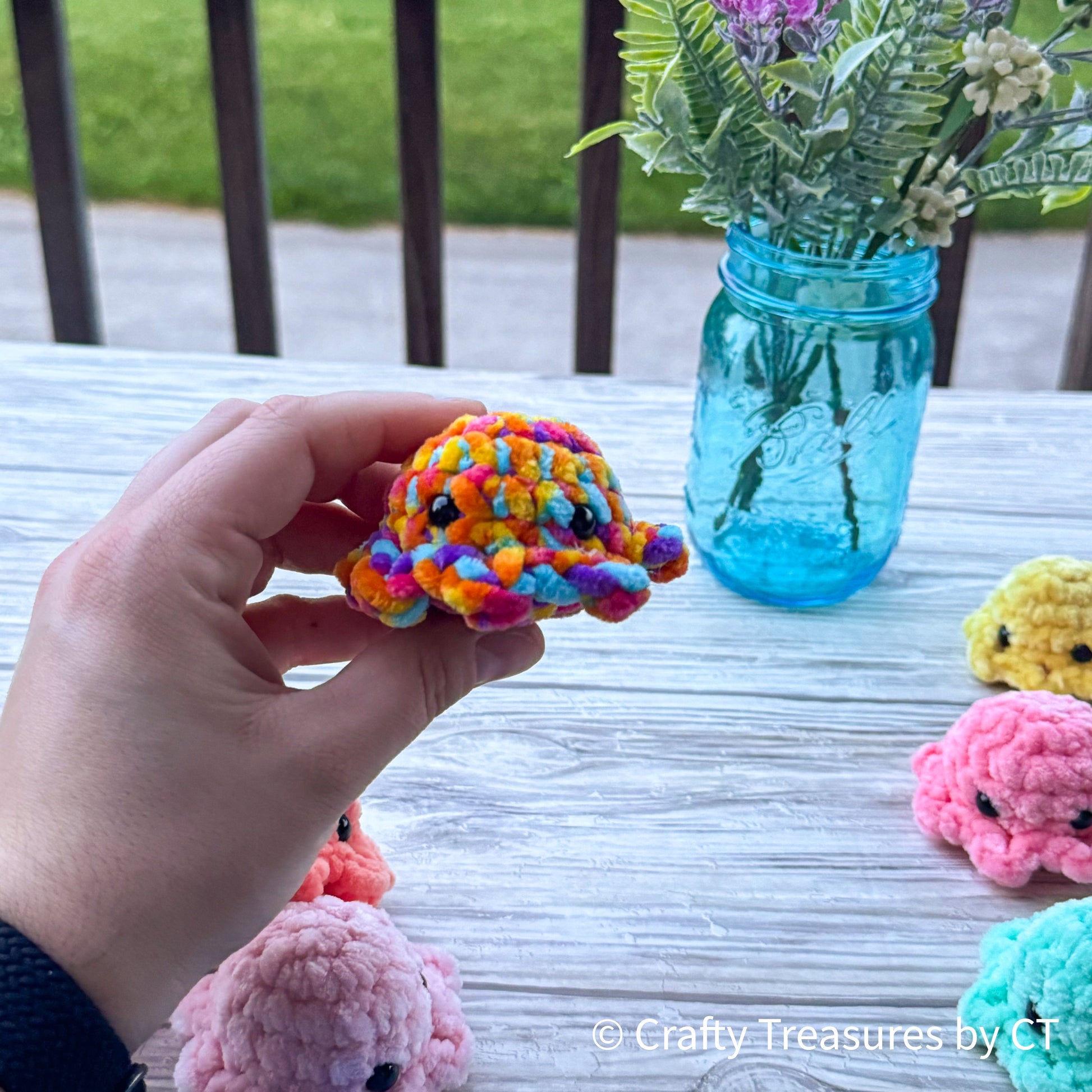 Each octopus is made with soft chenille yarn, fiber fill, and safety eyes.