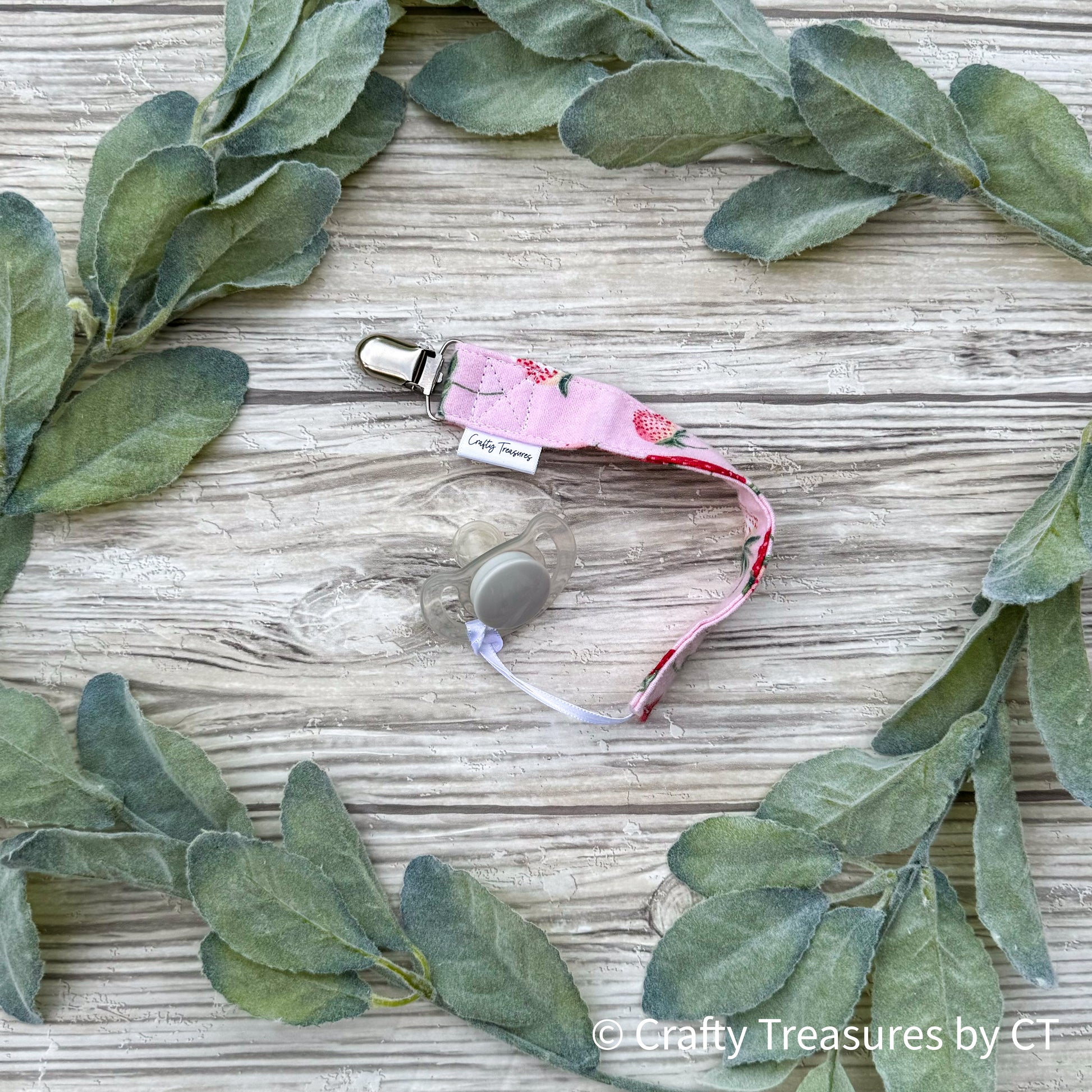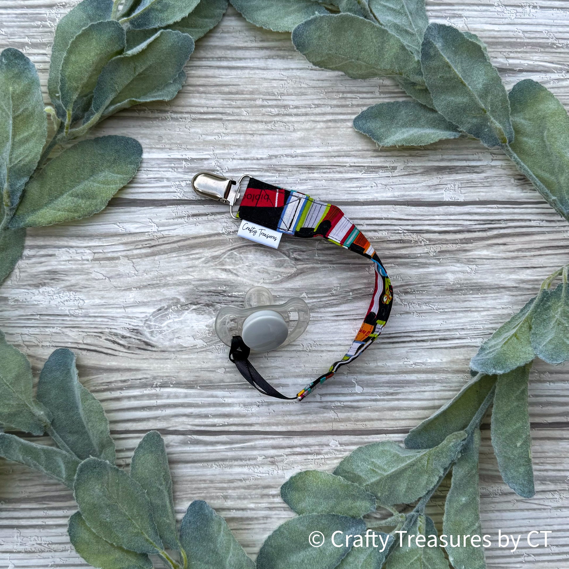 Each pacifier clip is made from 100% cotton fabric, 100% cotton thread, polyester ribbon, and a lead-free metal clip.